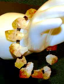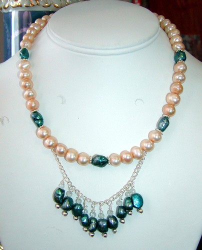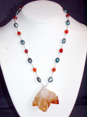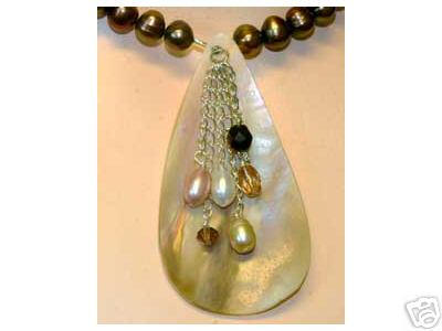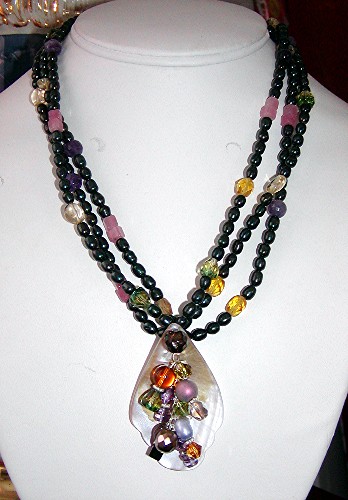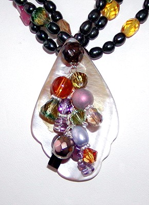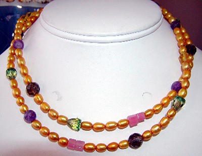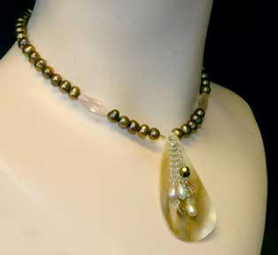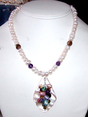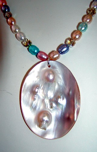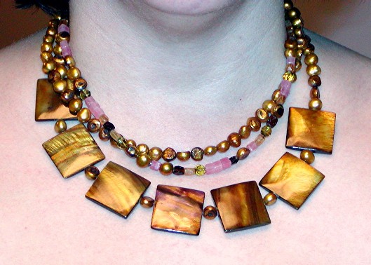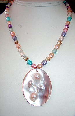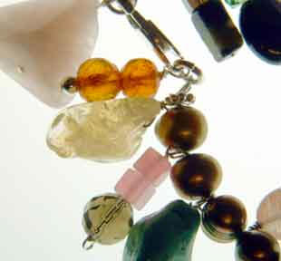 mother-of-pearl, freshwater pearls, citrine, pink jade and glass