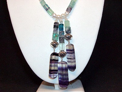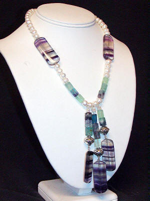 Striped fluorite, genuine freshwater pearls, fluorite beads, sterling silver beads and